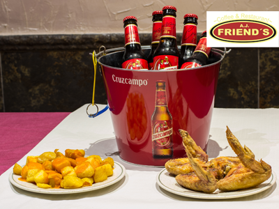 Un cubo de 5 botellines de Cruzcampo, buen ambiente, pantalla gigante para ver los partidos de la Champions y la Liga... y además una ración de alitas y otra de patatas bravas. Todo esto ahora con 47% de descuento en A.J. Friends, en el distrito madrileño de Vicálvaro. Tú decides si lo compartes o si te das tú solo este homenaje.A.J. Friends es especialista en platos americanos y mexicanos y es una de las cervecerías más animadas de la zona. Disfruta de un menú perfecto para cualquier momento: ración de alitas, ración de patatas bravas y cinco botellines de Cruzcampo. ¡No te lo pierdas! El cupón es válido para una o dos personas y lo podrás disfrutar mañana, tarde o noche.